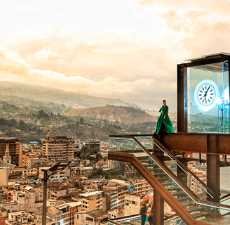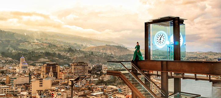 Junto al mirador se encuentra un gigantesco reloj de vidrio, que es uno de los símbolos más reconocidos de Ambato.